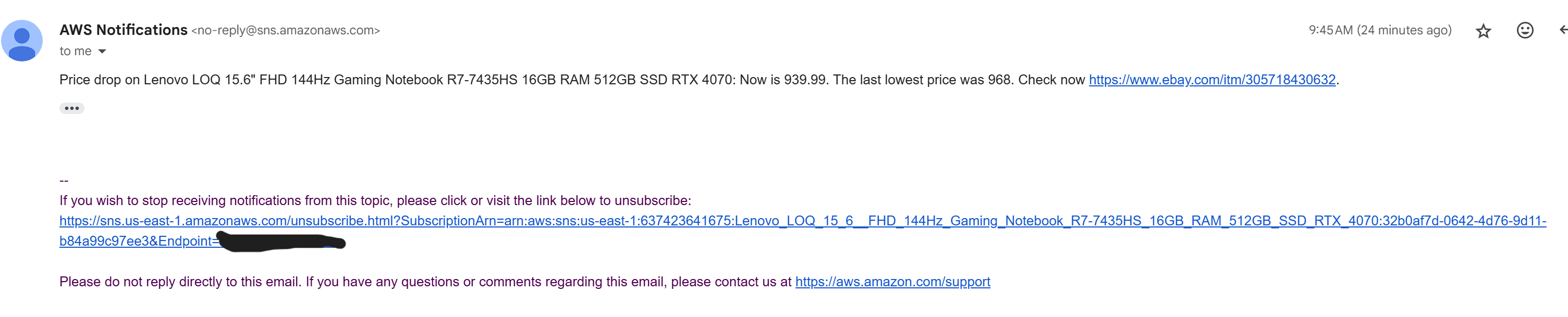 Step 4: If there’s a price drop, Lambda triggers the corresponding SNS topic to notify subscribers.