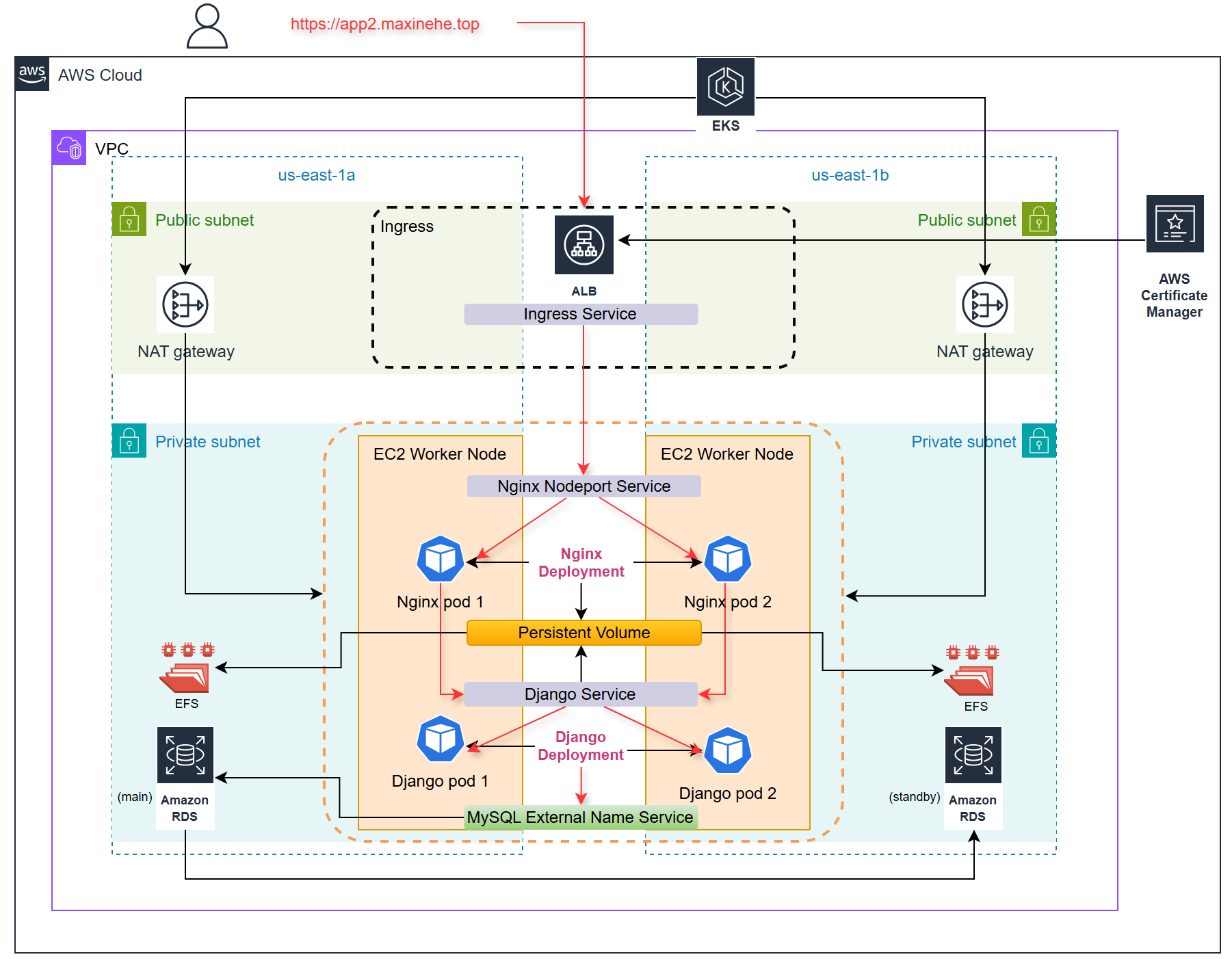 - Static File Handling: During pod initialization, Django generates static files that are stored in the EFS-backed Persistent Volume, making them easily accessible for Nginx.