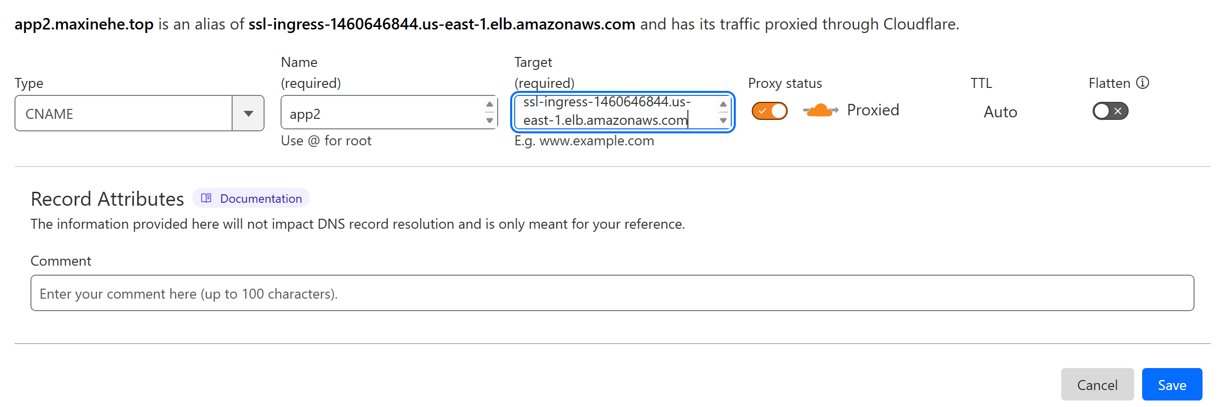 Finally, add the CNAME rule in the DNS server. Here I use Cloudflare: