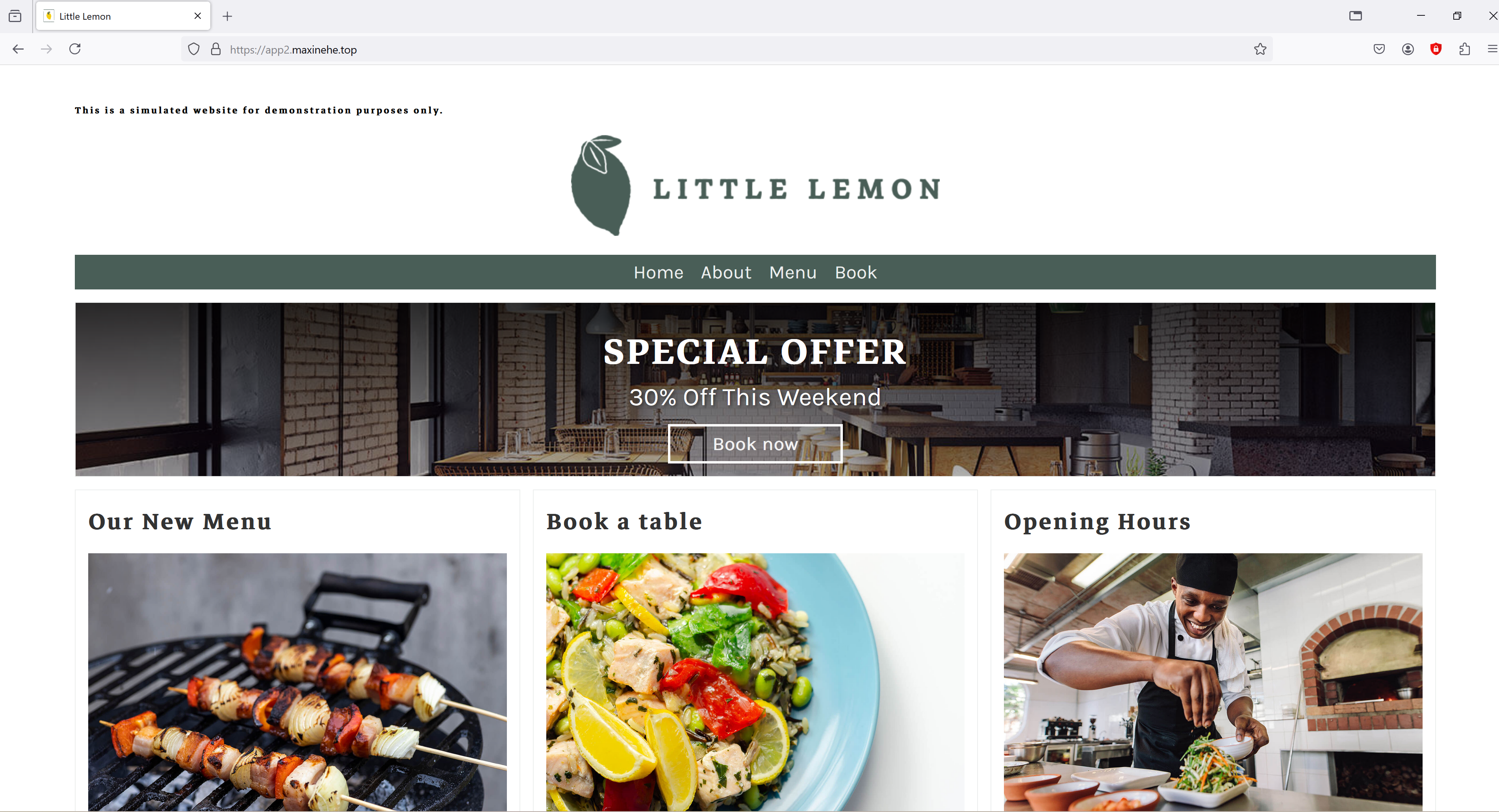 After deploying all YAML files, our website for LittleLemon restaurant is available at https://app2.maxinehe.top/. As a test, all functions work as expected. The Menu items stored in the database have also been recovered. API functions are working as expected. Cheers!