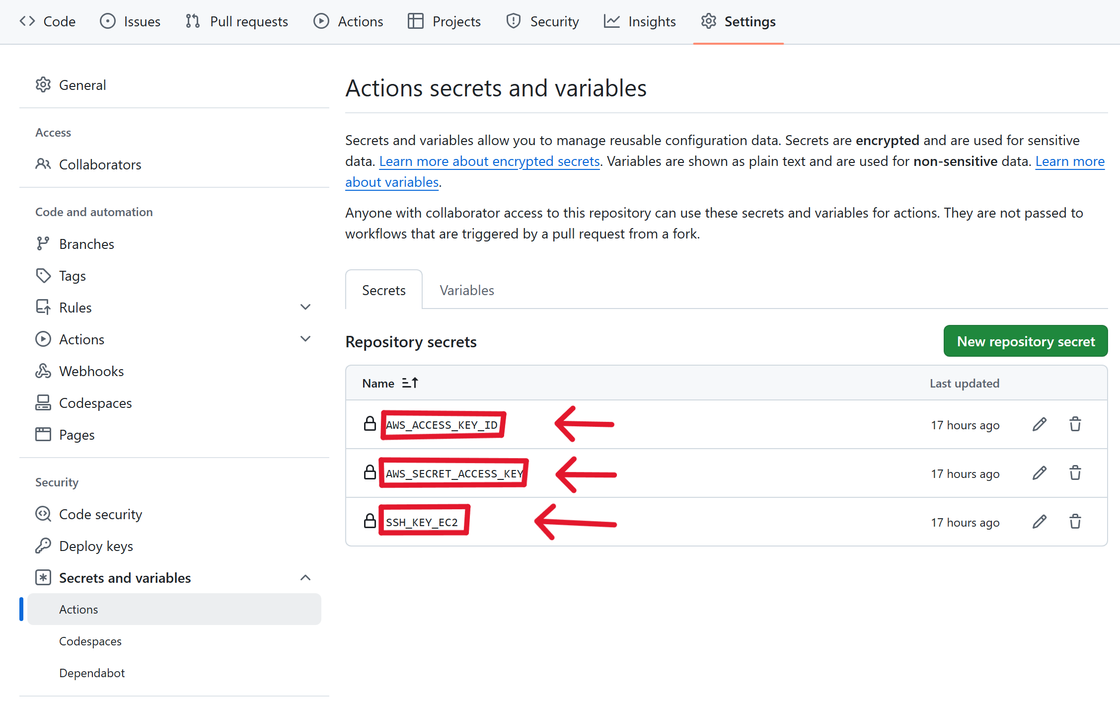 SSH Key: Generate an SSH key in AWS and save the private key in .pem format. Add this key to your repository secrets.