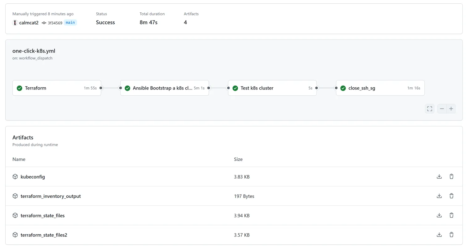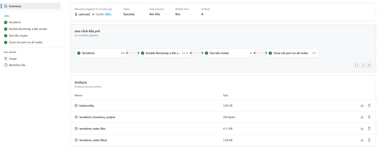 When the workflow completes successfully, you can download the kubeconfig file to access your cluster. Remember to handle sensitive artifacts carefully—running this workflow in a private repository is strongly recommended.