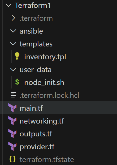 The Terraform configuration is responsible for creating the core infrastructure required for the Kubernetes cluster. The file structure is as follows and includes several key directories: