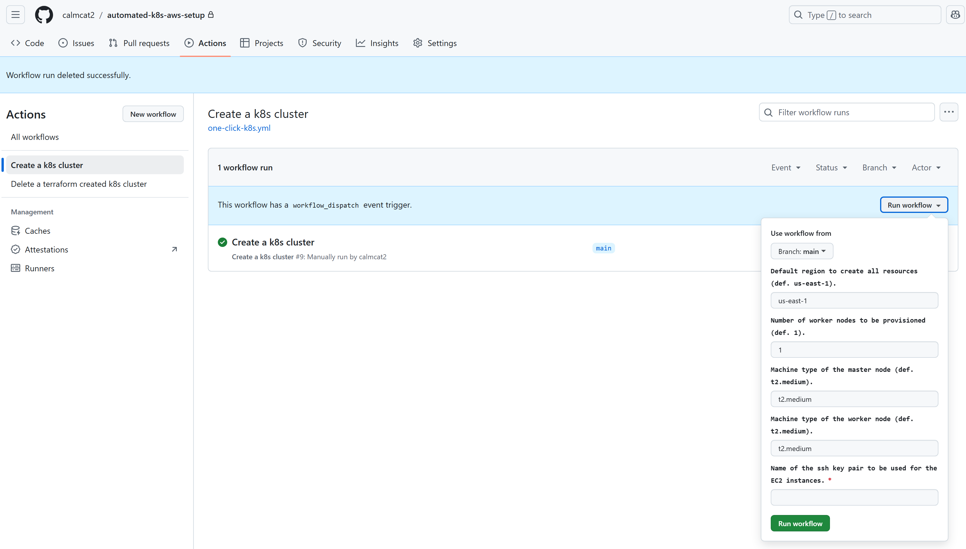 Go to the Actions page in the Github repository and choose the workflow Create a k8s cluster. As shown below, when you click Run workflow, You will be prompted to provide optional customization parameters and the SSH key name.